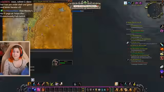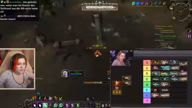 02:39:36Radlerauge und der Streamer vertiefen sich in WoW-Mechaniken. Themen sind Unterschiede zwischen Allianz und Horde, Gefahren in feindlichen Gebieten und PvP-Triggern. Der Streamer warnt vor Risiken wie dem Angriff von Wachen, der PvP aktiviert, und empfiehlt bei Gefahr sofortige Nutzung eines Ruhesteins. Weitere Diskussionen betreffen World Buffs, Flugpunkte und Quests wie 'Light of Elune'. Radlerauge wird geraten, vorsichtig zu erkunden und auf Chat-Tipps zu achten.