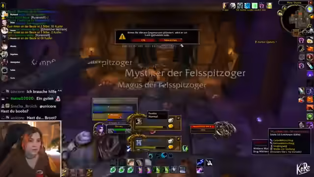 01:25:03Während des Dungeons treten unerwartete Probleme auf, wie der plötzliche Abgang eines Mobs und Missverständnisse über Patrol-Timings. Der Streamer unterbricht das Gameplay, um dem Chat einige Witze zu erzählen. Eine Serie von oft unvollständigen oder falsch erzählten Witzen, darunter Bombe im Bordell und Keks-Witze, sorgt für humorvolle Momente. Die Witze werden teilweise als 'Doppelschau' beworben, und die Interaktion mit dem Chat über die Qualität der Witze ist ein zentraler Punkt dieses Segments.