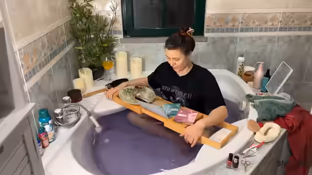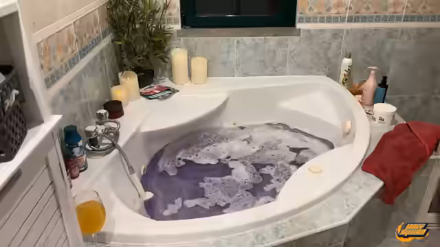 07:07:37Das Bad wird nun mit verschiedenen Badekristallen wie 'Gute Laune' und 'Zeit für Träume' gefüllt, was die Wanne in ein 'fancy schmancy' Licht taucht. Die romantische Stimmung wird jedoch getrübt, als die Kristalle den Schaum vollständig zerstören. Hilfi witzelt, dass ein Milchaufschäumer eine bessere Alternative gewesen wäre. Während des Badens wird auch über Haarausfall und mögliche saisonale Gründe diskutiert.