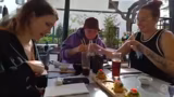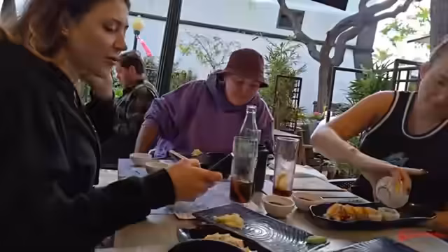 03:15:53Nach dem Ende der sportlichen Herausforderung wird die ursprüngliche Aufgabe des B-Spiels fortgesetzt. Nachdem ein Bingo erreicht wurde, fehlt nur noch ein letztes Feld – jemand, der in die Kamera winkt. Währenddessen werden alle hungrig und begeben sich auf einen Food Stand, um Essen zu bestellen. Die Bestellung wird aufgrund der großen Auswahl als überwältigend beschrieben, und es wird ausgiebig über verschiedene Sushi-Arten und andere Essenskulturen gesprochen.