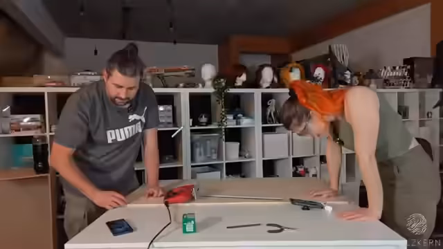 02:02:51Es wird beschlossen, zuerst die Bretter zu sägen, bevor der Tunnel fertiggestellt wird. Es wird diskutiert, wer was vorbereiten soll, wobei Vorwürfe der Untätigkeit und des Nichtzuhörens laut werden. Es wird versucht, das Werkstück mit dem Körpergewicht zu fixieren. Es wird befürchtet, dass das Teppichmesser am Hintern platzen könnte. Es wird festgestellt, dass der Hintern auf dem Tisch sitzt und Späne in den Tisch schneit. Es wird überlegt, die Rollen zu tauschen und wer was arbeiten soll. Der Tunnel wird erfolgreich mit dem Cutter durchgeschnitten, was überraschenderweise besser funktioniert als mit der Stichsäge. Es wird beschlossen, echtes Holz zu sägen. Es wird festgestellt, dass das teure Zeug besser zu schneiden ist. Das Teststück wird als solches entlarvt, da das Furnier fehlt. Es wird festgestellt, dass 18 Euro für das Teststück ausgegeben wurden. Es wird überlegt, das Teststück noch richtig zu schleifen. Es wird festgestellt, dass ein halber Tunnel gebaut wurde. Es wird beschlossen, zuerst die Bretter zu schneiden, um die Lärmbelästigung zu minimieren.