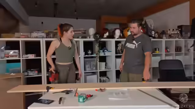 01:21:32Es wird festgestellt, dass die Tischplatte einen Bogen hat, möglicherweise durch Feuchtigkeit verursacht. Es wird überlegt, ob man die krummen Stücke nach unten oder oben anbringen soll, wobei die Entscheidung auf unten fällt, um die Optik zu verbessern. Der Versuch, das Holz gerade zu schleifen, beginnt mit der Überlegung, welches Schleifpapier verwendet werden soll. Die Freude über einen rechten Winkel wird ausgedrückt, was die Möglichkeit eröffnet, das Werkstück gerade zusammenzuschrauben. Das Ergebnis wird als Präsentationsbox für Katzen bezeichnet und die Möglichkeit der Nutzung für Aquascaping angedeutet. Es folgt die Feststellung, dass das Werkstück wackelt und Luft hat, was jedoch nicht als Problem angesehen wird. Es wird bemerkt, dass die Werkzeuge eingesifft sind, und es wird vermutet, dass dies mit dem Umzug zusammenhängt. Die Frage wird aufgeworfen, ob man das Holz nicht im Baumarkt hätte zuschneiden lassen können, um Zeit zu sparen.