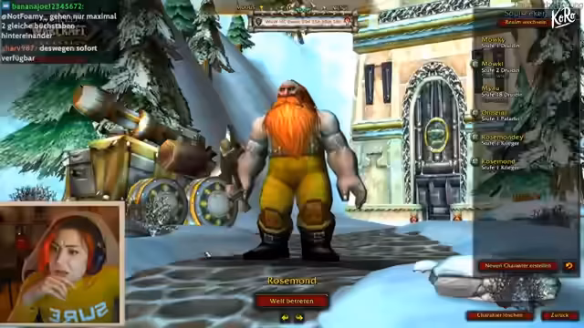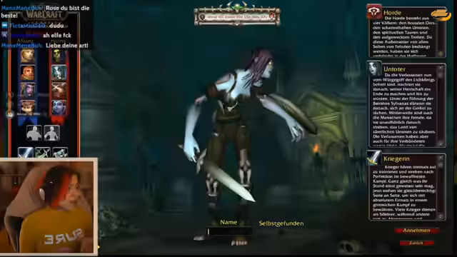 05:10:04Nachdem die Spielerin Rose sich für den Server 'Soul Seeker' entschieden hat, erklärt die Community die Bedeutung von Realm-Names als Seiten eines großen Buches. Rose wählt als Volk die Nachtelfen und als Klasse den Druiden, nachdem verschiedene Optionen wie Kriegerin und Jäger ausführlich diskutiert und für ungeeignet befunden wurden. Eine Überraschung kommt von einer Viewerin, die bereits den Namen 'Rose Moki' für den Charakter gespeichert hat, was große Freude auslöst. Dies ermöglicht Rose, sofort mit dem eigentlichen Spiel zu beginnen.