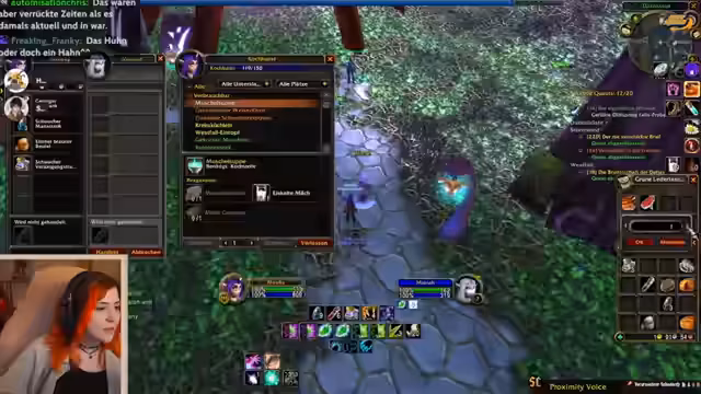 08:05:32Es werden spielmechanische Fragen zu World of Warcraft geklärt. Ein Spieler hat eine Verzauberungsklasse und fragt nach den Vorteilen seiner Fähigkeiten, während ein anderer ein Ingame-Problem hat und nicht weiß, wie er Kräuter zu Tränken verarbeitet. Die Chatmitglieder helfen, indem sie auf Zauberbücher und Händler hinweisen. Auch Klassenrollen und spezielle Quests werden diskutiert, um sicherzustellen, dass jeder Spieler versteht, was zu tun ist, bevor die nächste Mission beginnt.