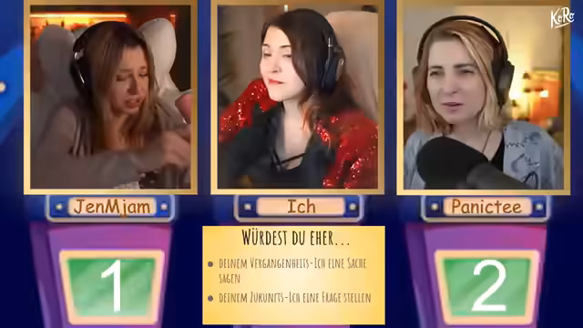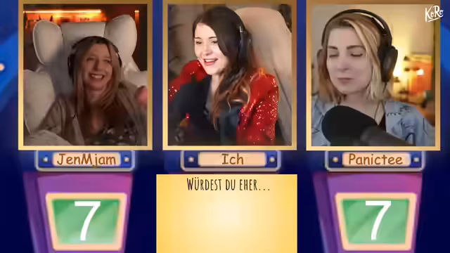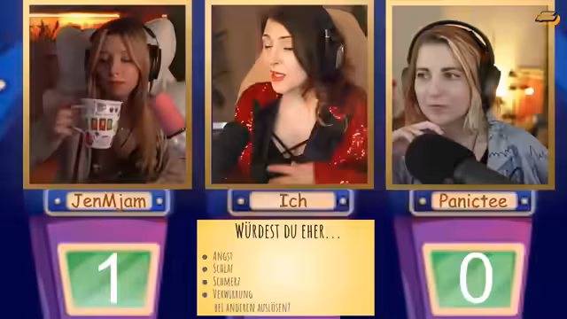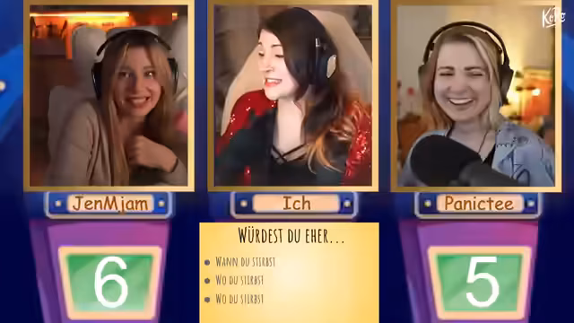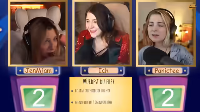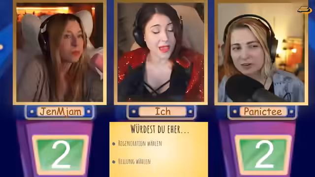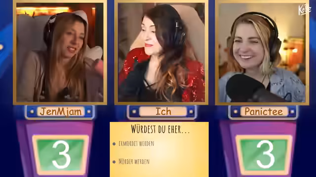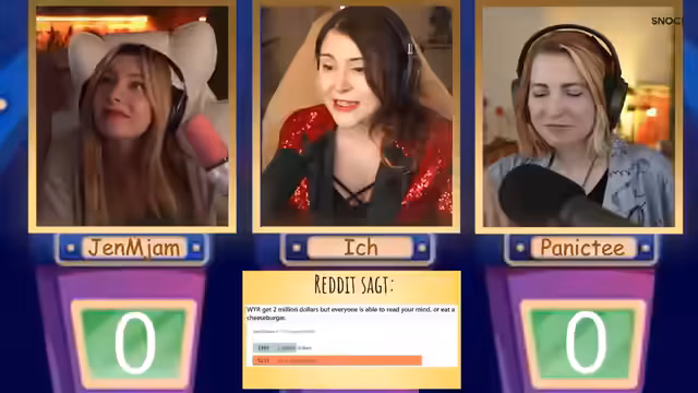 03:20:09Die erste Frage lautet: "Würdest du eher 2 Millionen Euro erhalten, aber jeder kann deine Gedanken lesen, oder einen Cheeseburger essen?" Jen entscheidet sich für den Cheeseburger, da sie befürchtet, dass ihre manchmal "schmutzigen" Gedanken kontraproduktiv wären und der Reichtum sie ihrer Passion für das Streaming berauben könnte. Sie argumentiert, dass 2 Millionen Euro zwar verlockend seien, ihr aber ihre Gedanken heilig sind und ein Cheeseburger ohne Gurken eine gute Alternative darstellt. Panik-Fee hingegen wählt die 2 Millionen Euro, da sie der Meinung ist, dass die meisten Menschen mit ihren Gedanken überfordert wären oder es ihr sogar das Erklären in vielen Situationen ersparen würde. Die Abstimmung auf Reddit zeigt, dass 5.223 von 7.132 Personen den Cheeseburger gewählt haben, womit Jen den ersten Punkt gewinnt. Panik-Fee kommentiert dies mit Humor und betont ihren Reichtum.