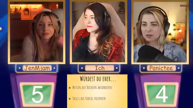 04:03:04Die zwölfte und letzte Frage ist: "Würdest du eher Wissen aus Büchern absorbieren, indem du sie anfasst, oder Skills aus Videos erlernen?" Jen wählt das Wissen aus Büchern, da sie die Möglichkeit sieht, unendlich viele Sprachen und Informationen zu lernen. Sie argumentiert, dass dieses Wissen auch das Erlernen physischer Skills beschleunigen würde. Panik-Fee hingegen entscheidet sich für Skills aus Videos, um beispielsweise Klavier spielen zu lernen, und betont, dass sie bereits viel Wissen aus Büchern hat. Reddit hat mit 6.229 Stimmen abgestimmt, wobei die Mehrheit (3.216 Stimmen) die Skills aus Videos bevorzugte. Jen verliert somit einen Punkt, und die Diskussion über die unterschiedlichen Denkweisen von Männern und Frauen auf Reddit wird erneut aufgegriffen.