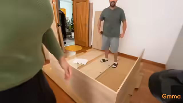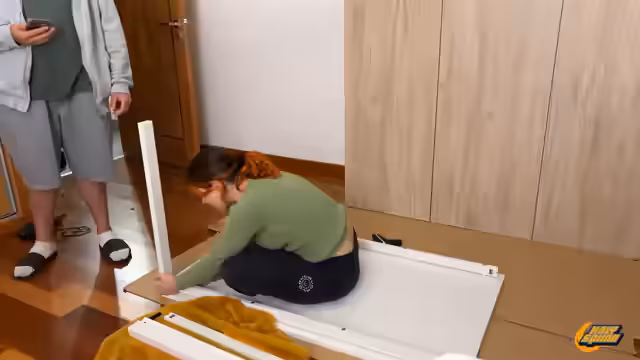 03:29:16Ein zentraler Schritt ist der Einbau des Schrankbodens, der für die Stabilität entscheidend ist. Gleichzeitig offenbart sich ein weiteres erhebliches Problem: die Rückwand wurde falsch herum angebracht, was eine Drehung des gesamten, bereits weitgehend aufgebauten Schranks erfordert. Dies führt zu Diskussionen über die Materialqualität, die als minderwertig kritisiert wird, und führt zu Verzögerungen, da der Schrank nun gedreht werden muss.