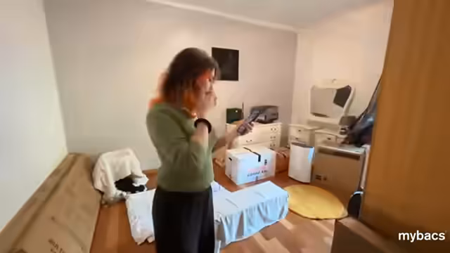 Ein großer Raum wird in ein Wohn- und Arbeitsbereich umgewandelt. Es wurden erste Möbel aufgebaut und die Herausforderungen des Neubaus deutlich. In einem Teil des Hauses gibt es bereits Feuchtigkeitsschäden, was die zukünftige Nutzung beeinträchtigen könnte.