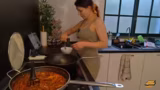 03:00:52Die Zubereitung der Lasagnesuppe schreitet voran, wobei die Streamerin flexibel mit den Zutaten umgeht. Sie brät Zwiebeln, Sellerie und Möhren an und würzt das Gericht mit Oregano, Basilikum, Paprikapulver und Cayennepfeffer. Die Sauce wird mit Tomatenmark gestreckt und mit Brühe und etwas Chiliöl aufgegossen, da der Rotwein fehlt. Ziel ist es, eine säuerliche und würzige Basis für die Lasagne-Nudeln zu schaffen.