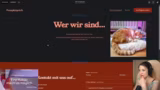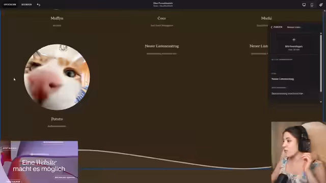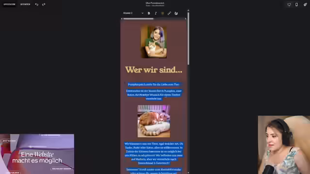 02:57:43Nachdem der Grundgerüst der Website steht, werden weitere Details gefüllt. Es wird ein Textblock für die 'Über uns'-Seite verfasst und mit Fotos der Katze Pumpkin bestückt. Der Streamer kann Bilder per Discord von den Zuschauern empfangen und direkt einfügen. Auch die Integration von Social-Media-Links wie Instagram und Discord für die Community 'Tiere machen alles besser' wird erledigt.