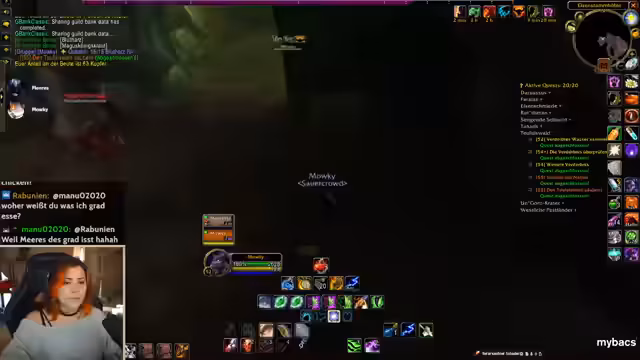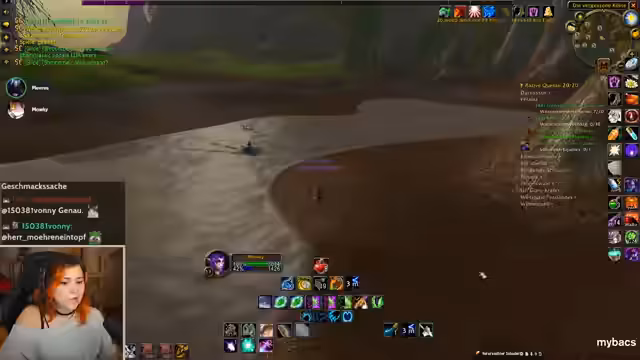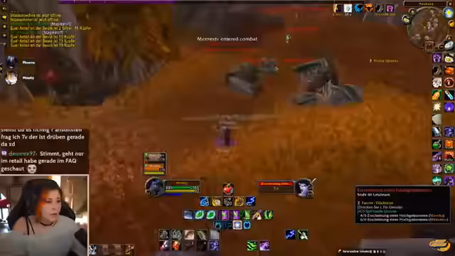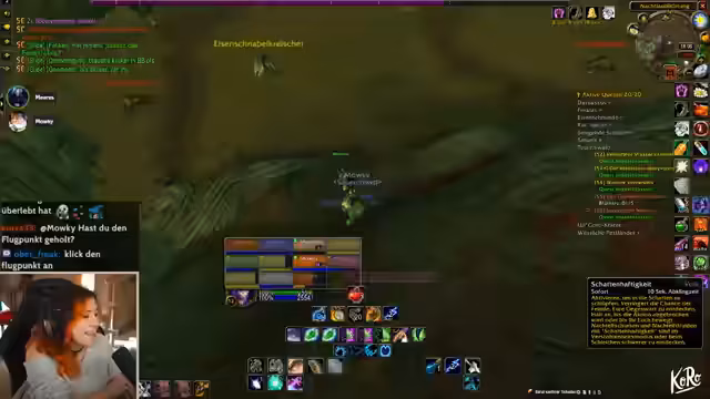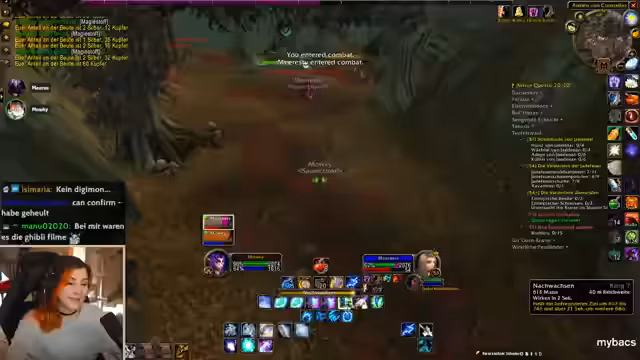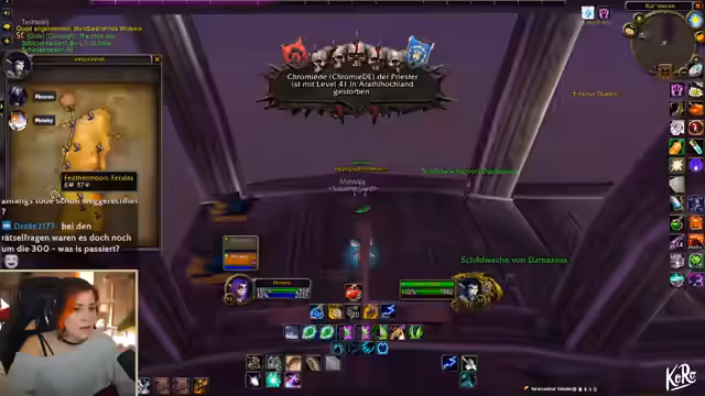 00:24:20Während des gemeinsamen Spielens von World of Warcraft wird im Chat über den Tod eines Spielers namens Hanky berichtet. Dieser ist im Hardcore-Modus bei einem Versuch, Goblin-Zapper zu verwenden, an den eigenen Explosionen gestorben, was zu erheblichem Spot und Meme-Potenzial im Chat führt. Im weiteren Verlauf der Session werden verschiedene Quests in Gebieten wie Red Ridge und Felwood absolviert, während die Streamerin über ihren Zustand klagt und auch über das Verspäten ihres Essens klagt.