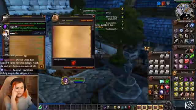 05:44:31Es finden verschiedene Interaktionen mit Gildenmitgliedern statt. Ein Spieler bittet um Unterstützung bei einer Krieger-Quest und bietet im Gegenzug Klingendorntal-Seiten an. Es entwickelt sich ein humorvolles Tauschgeschäft, bei dem der Streamer dem Spieler Hilfe zusagt und dabei die Gildenbank nutzt. Ein weiterer Spieler mit einem exzentrischen Ruf wird vorgestellt, dessen Verhalten im Discord mit Selbstgeißelung und intensivem Roleplay beschrieben wird.
