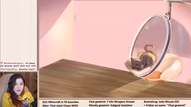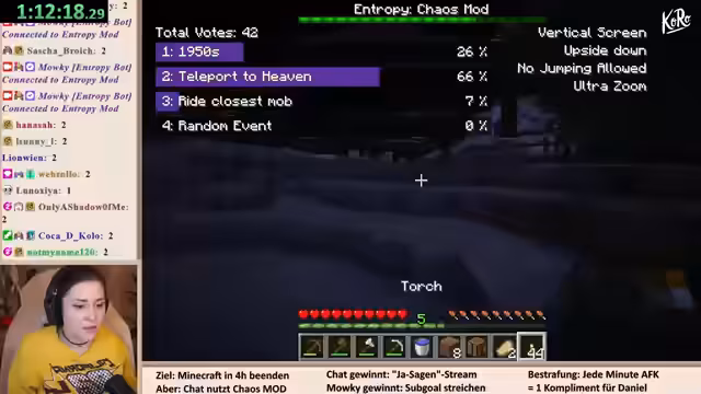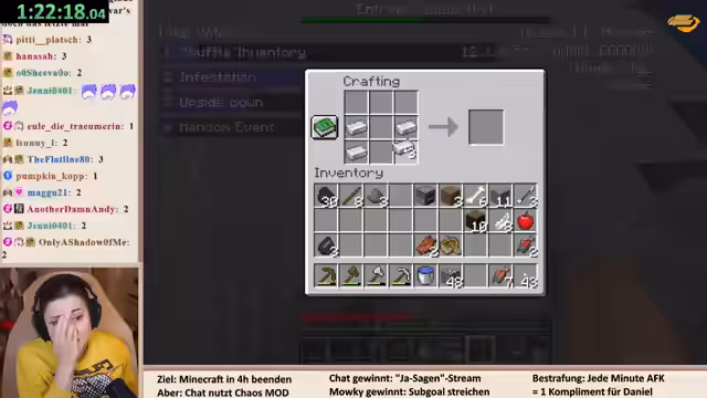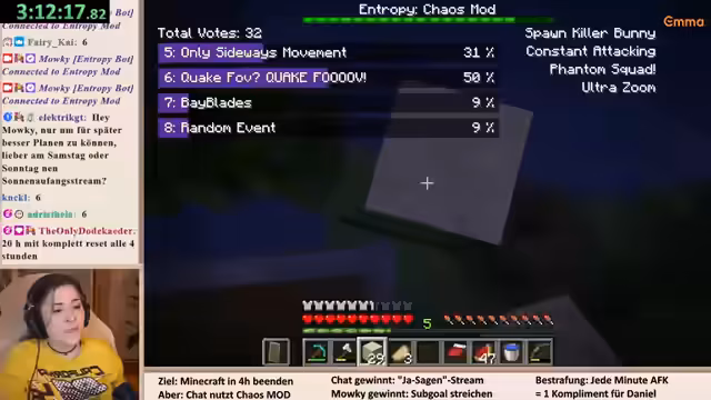 05:55:12Der Streamer beginnt mit der Ressourcensammlung und steht unter Zeitdruck, da er ein Ziel in vier Stunden erreichen muss. Er diskutiert mit dem Chat über Verhandlungen, bei denen der Chat im Austausch für Gegenstände wie Eisen oder Futter fordert, dass der Streamer ein Maid-Kostüm trägt. Parallel dazu sammelt er Eisen und versucht, einen Helm zu bauen, während der Chat versucht, ihn durch Abstimmungen zu sabotieren, etwa durch Lärm oder das Platzieren von Mobs.