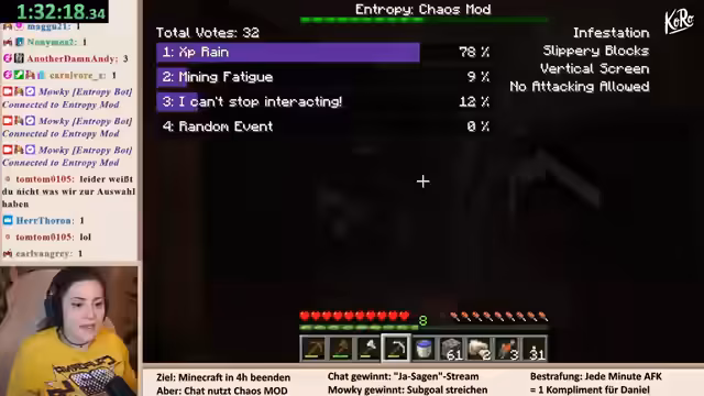 06:03:20Die Verhandlungen mit dem Chat spitzen sich zu, als der Streamer Diamanten findet und eine Diamantpickaxe baut. Der Chat bietet nun größere Mengen an Ressourcen an, im Austausch für extremere Forderungen wie ein komplettes Outfit oder Lächeln während des Streams. Gleichzeitig kommt es zu Kämpfen, bei denen der Streamer von Mob-Angriffen und Chat-abgestimmten negativen Effekten wie 'Invertierte Steuerung' betroffen ist, was seine Fortschritte behindert.