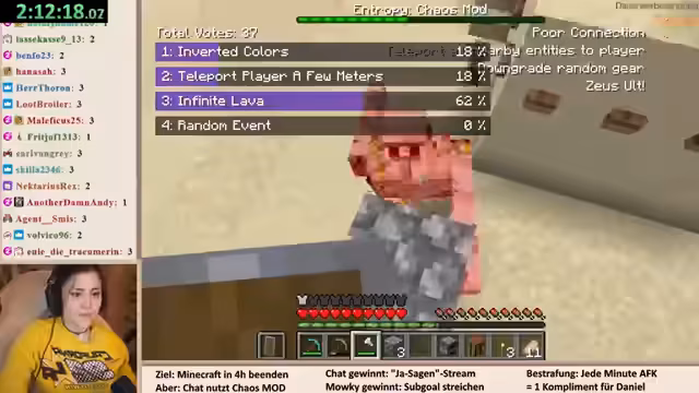 07:30:00Ein Raid mit über 200 Zuschauern tritt dem Stream bei, während der Streamer weiterhin nach Lava sucht und verzweifelt neue Deals anbietet, darunter das Tragen von Maid-Kostümen oder das Aufgeben von Subgoals, falls der Chat ihn beim Nether-Betreten unterstützt. Der Chat bleibt hart und lehnt Angebote ab, stattdessen werden weitere Sabotage-Abstimmungen wie 'Random Gear Downgrade' initiiert, die dem Streamer letzte Ressourcen rauben und ihn in eine ausweglose Situation bringen.
