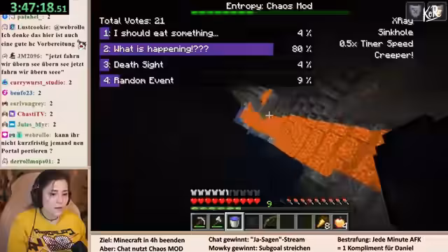 06:13:20Der Streamer konzentriert sich auf die Suche nach Lava, um ein Portal zum Nether zu bauen, findet aber nur minimal Ressourcen. Der Chat lehnt Verhandlungen ab und erschwert die Suche durch Abstimmungen, die Lava verstecken oder Gegenstände stehlen. Der Streamer verliert wertvolle Zeit und Ausrüstung, einschließlich seiner Diamantpickaxe, und äußert wachsende Frustration über die Sabotage, während er verzweifelt nach Lösungen sucht, etwa durch den Bau zusätzlicher Öfen oder das Töten von Schafen für Wolle.