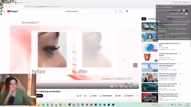 00:37:23Mauki schildert den Termin in einer Beauty-Klinik auf Madeira, die aufgrund von Beauty-Tourismus oft ausgebucht war. Der Eingriff bestand aus zwei Teilen: einem Laser (Smooth Eye Laser) und einer Vitamin-Spritze. Der Laser-Eingriff beschreibt sie als extrem unangenehm und schmerzhaft, da er mit einem kleinen Punkt die Haut abbrannte, während gleichzeitig Kaltluft auf das Auge geblasen wurde, was zu einer Panikattacke führte. Die anschließende Vitamin-Spritze in die bereits verbrannte Haut war ebenfalls sehr schmerzhaft, da keine Betäubung verwendet wurde und jeder Pikser gespürt werden konnte. Die Prozedur dauerte etwa eine Stunde und wurde als eine Art Martyrium empfunden.
