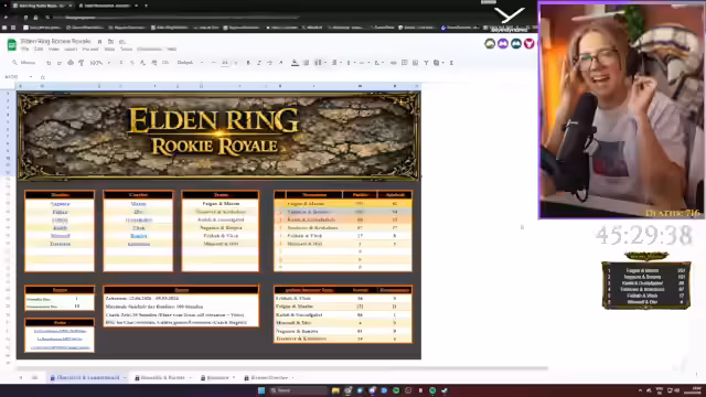 00:09:29Willkommen zum LiveStream! Der Streamer begrüßt die Zuschauer und gibt ein paar wichtige Ankündigungen bekannt. Das Elden Ring Rookie Royale wird für eine Woche verlängert, um den Teilnehmern mehr Zeit zu geben, die 100 Stunden zu erreichen. Das Finale Event ist nun am 9. Mai angesetzt. Minus Elf und Divi müssen leider das Rennen verlassen, da sie nicht genügend Zeit haben. Trotzdem sind noch fünf Teams im Rennen, die um den Sieg kämpfen können.