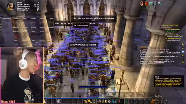 03:03:38Im Zuge eines Community-Events für ein World of Warcraft Hardcore-Spiel, wird eine Abstimmung über die Fraktionswahl durchgeführt. Der Streamer und die Community entscheiden sich, die Allianz zu wählen, um in deren Hauptstadt Ironforge zu spielen und von den Berghöhen zu profitieren. Nach der Abstimmung wird ein Quiz durchgeführt, um die Rasse und Klasse der teilnehmenden Streamer zu bestimmen, was für das Event eine wichtige Grundlage darstellt.