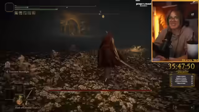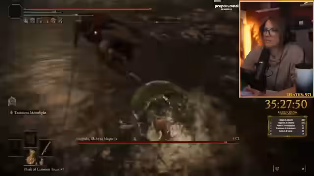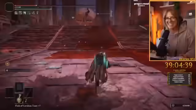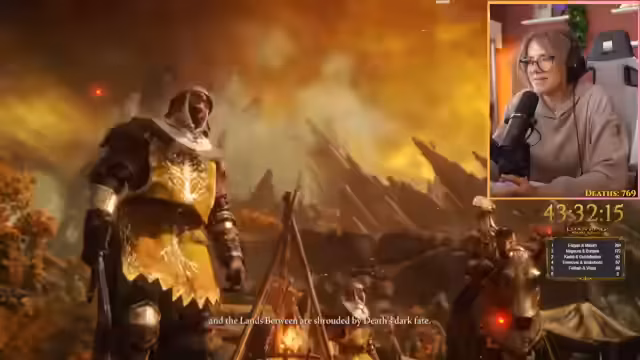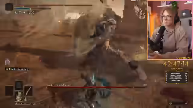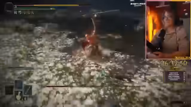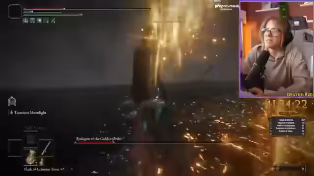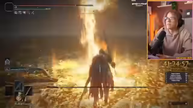 03:30:17Der Streamer kämpft gegen den Boss Radagon und experimentiert mit verschiedenen Managements für seine Mana-Bar. Er versucht, ohne Mana-Bar auszukommen, stellt aber fest, dass er dabei viel weniger Schaden verursacht. Auch die normale Hitze-Attacke scheint keine Wirkung zu zeigen. Der Streamer gibt zu, nicht alle Bosse im Spiel besiegt zu haben, da er das Spiel neu beginnt. Bei einem Versuch, Radagon zu besiegen, stirbt er und muss erneut beginnen.