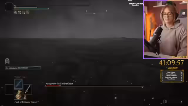 09:39:24Der Streamer setzt seine Versuche fort, Malenia zu besiegen, obwohl er sich zunehmend frustriert zeigt. Er experimentiert mit verschiedenen taktischen Ansätzen, wie das Meiden ihrer Angriffe und die Nutzung von Heiltränken, aber verliert immer wieder den Kampf. Er erwähnt, dass seine Ausdauer ein limitierender Faktor ist.