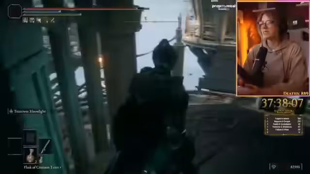 07:56:34Nach weiteren Erkundungen trifft der Streamer auf Malenia, Blade of Miquella. Er ist sowohl nervös als auch aufgeregt über diesen als besonders schwierig geltenden Boss. Er beginnt den Kampf ohne Spoiler und versucht, ihre Angriffsmuster und Fähigkeiten selbst zu entdecken, insbesondere deren Blutungsmechanik, bei der sie sich bei Treffern heilt.