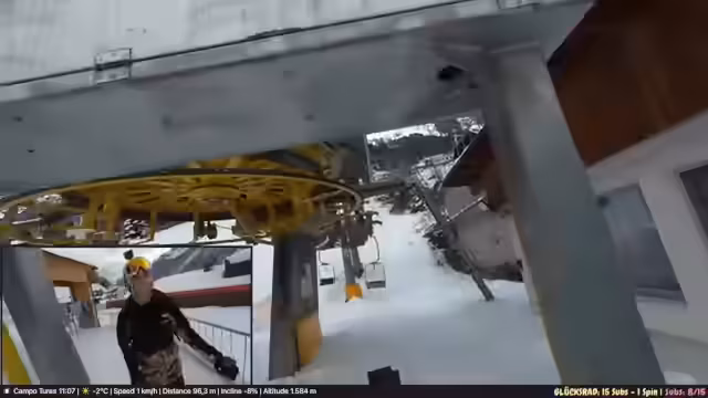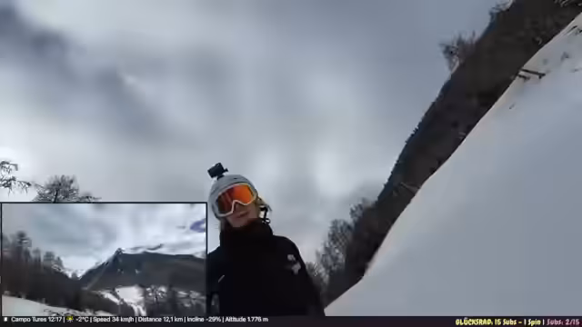 00:13:43Nach erfolgreicher Vorbereitung startet die erste Abfahrt. Das Skigebiet ist klein, übersichtlich und nur über einen Schlepplift erreichbar. Die Schneequalität wird als in Ordnung, aber nicht ideal beschrieben. Der Streamer nutzt ein Double-Cam-Setup, wobei eine Kamera auf dem Helm und die andere am Selfie-Stick befestigt ist. Während der Fahrt interagiert er mit den Zuschauern, erklärt Begriffe wie 'schneitzen' für Nase putzen und bemerkt, wie laut die Umgebung beim Skifahren ist.