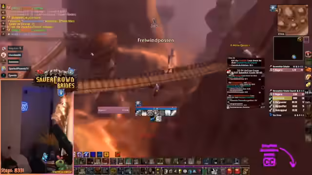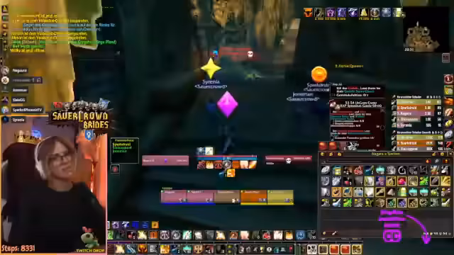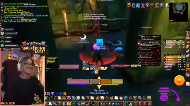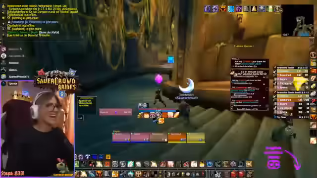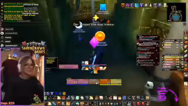08:26:05Auf dem Weg zum Tempel des Atal'ai trifft der Streamer auf einen Elite-Boss, Schandra die Spinne, und überlegt, ob er sich heilen oder den Kampf versuchen soll. Nach der Ankunft im Dungeon wird die Gruppe mit Problemen konfrontiert. Die Wände sind buggy und es gibt viele Monster, die schwer zu kontrollieren sind. Der Streamer muss sich auf seine Rolle als Krieger konzentrieren, um Agro zu halten, und fordert die Gruppe auf, ihn zu unterstützen.