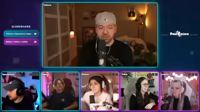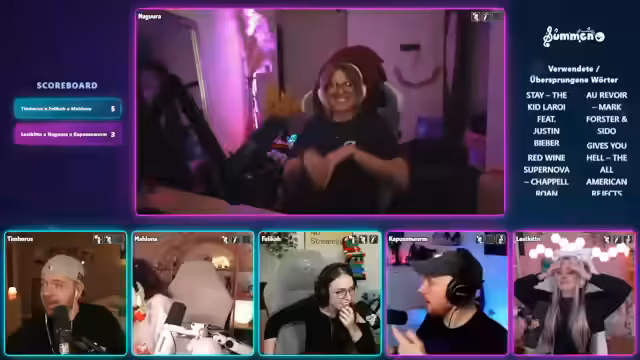 02:52:13Im Verlauf der Runden gibt es viele spannende Momente. Zeichnen wird oft als schwierig empfunden, während bei Pantomime Begriffe wie 'Panzer' oder 'Auf einer Bananenschale ausrutschen' zu lustigen Darstellungen führen. Die Teams sind bis kurz vor Schluss Kopf-an-Kopf im Rennen. Am Ende gewinnt Team Nagura, Kapuzenwurm und Tim Horus knapp vor Team Maluna, Felica und Lost Kitten, wobei der Sieg erst in der finalen Runde entschieden wird.