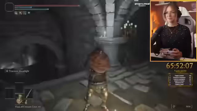 00:49:56Der Streamer ist weiterhin auf der Suche nach dem richtigen Weg zu einem Baum und stößt auf weitere Hindernisse wie versteckte Eingänge, Quallen und einen Boss. Er findet einen Talisman und eine Axt. Nach einem Kampf gegen eine Riesenkrabbe und weiteren Gegnern erreicht er einen Aufzug. Er wird von einem Magier angegriffen, der sich hinter einem Schild versteckt und Blitze schießt. Nach einem Kampf gegen mehrere goldene Ritter findet er finally einen Weg weiter.
