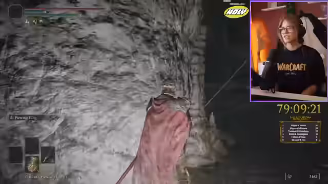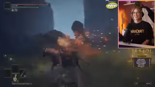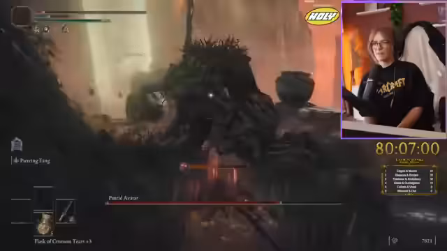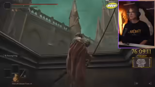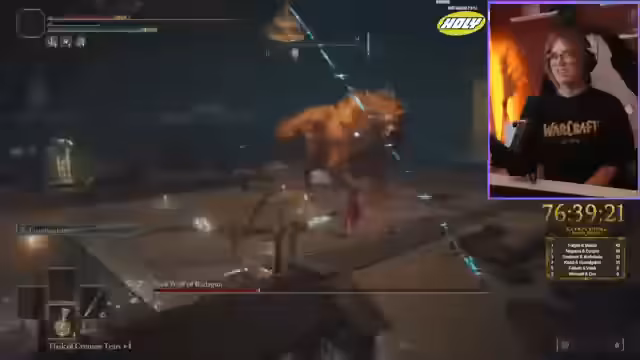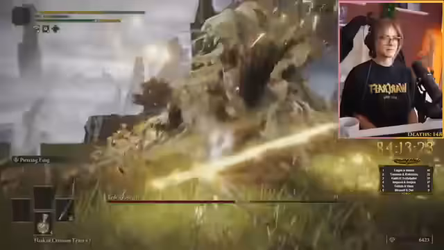 06:40:48Der Streamer navigiert durch eine komplexe Umgebung, verfehlt mehrere Gelegenheiten, Graces zu finden, und folgt einem unsichtbaren Pfad, der ihn zu einem neuen Boss führt. Er kämpft gegen einen Drachen, der enorme Feuer- und Laserangriffe abfeuert, was extrem schwierig ist, da der Drache oft außer Reichweite ist. Nach mehreren Versuchen besiegt er den Drachen, erhält eine Dragonheart und schaltet neue Fähigkeiten frei.