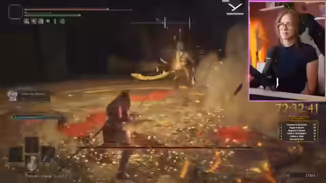 02:08:54Der Streamer kämpft gegen einen anspruchsvollen Boss im Erdreich, der aufgrund seiner Größe und schnellen Attacken schwierig zu treffen ist. Er hat Schwierigkeiten, die Animations des Bosses rechtzeitig zu erkennen, muss raten und erleidet dabei erheblichen Schaden. Trotzdem sammelt er Runen, nachdem er den Boss besiegt hat, und überlegt, seine Waffe zu upgraden, da er 38.000 Gold gesammelt hat. Er beschreibt den Kampf als sehr anstrengend und frustrierend, da er den Boss aufgrund seiner Größe und Bewegungsmuster nur schwer treffen kann.