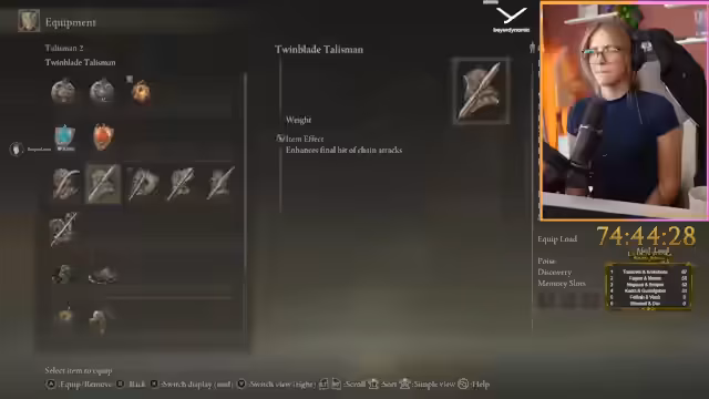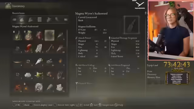 01:00:17Der Streamer legt großen Wert auf den optimalen Ausbau seiner Waffe und der eigenen Skills. Er erwägt, die Punktverteilung zu respekten, um das Moonveil-Katana nutzen zu können, da Intelligenz benötigt wird. Gleichzeitig discutiert er über die Verteilung von Attributen wie Dexterity, Vigor und Stamina, wobei der Chat bei der Entscheidungsfindung unterstützt. Auch die Verwendung von Talismanen und Crystal Tears wird erörtert, um den Schaden zu maximieren.