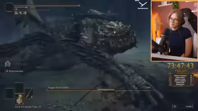 04:52:55Der Streamer beginnt mit dem Kampf gegen den nächsten Remembrance-Boss gegen 16 Uhr. Er äußert sich unsicher über die Schwierigkeit, da der vorherige Boss nicht mehr als schwierig empfunden wurde. Während des Kampfes diskutiert er über verschiedene Taktiken wie Waffenwahl (einhandig gegenüber zweihändig) und die Herausforderungen, die schnellen Feuerbälle des Bosses zu umgehen. Er bemängelt, dass es schwierig ist, zwischen den Attacken Heil-Tränke zu verwenden und verliert mehrmals das Leben.