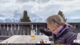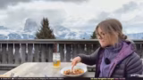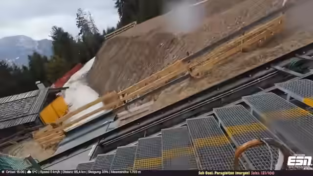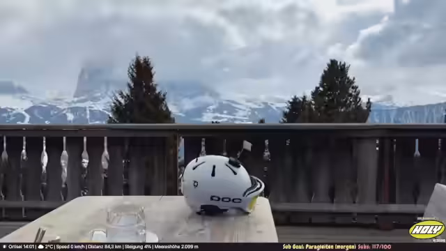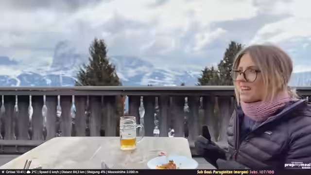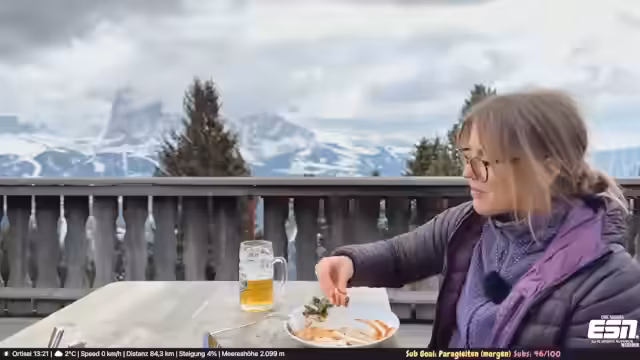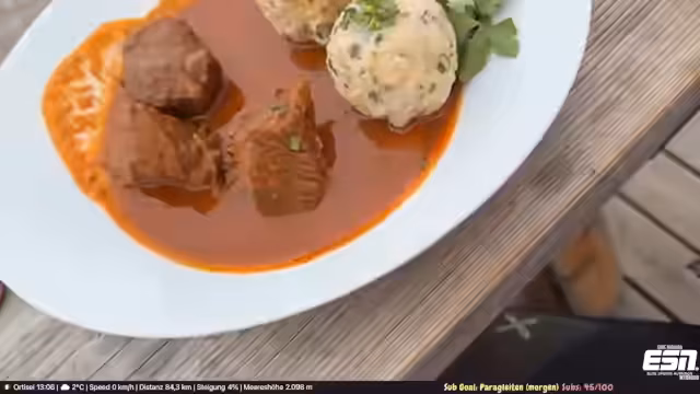 02:14:15Der Weg führt hinauf zur Rodelbahn, die trotz später Jahreszeit noch geöffnet ist. Die zumutbaren Verhältnisse und das knappe Schneeangebot werden kritisch beäugt. Oben angekommen, wird der Aufenthalt in einem Bergrestaurant beschrieben. Nachdem eine Abstimmung im Chat entschieden hat, bestellt der Streamer Gulasch mit Knödel. Während des Wartens auf das Essen werden die Aussicht auf die Dolomiten, das leicht fallende Schneetreiben und der Genuss eines verdienten Bieres gezeigt.