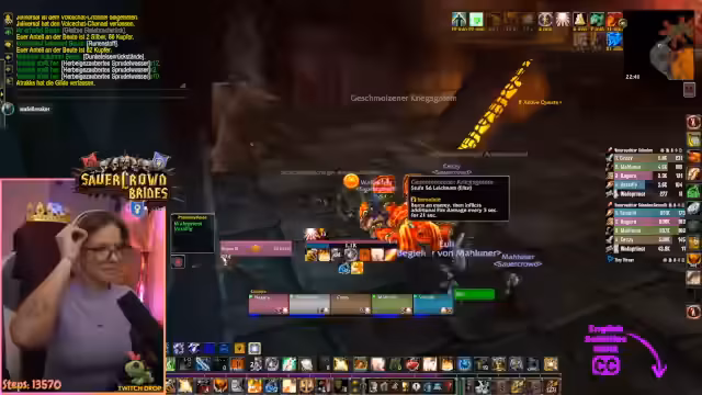 10:49:18Ein Paladin-Boss mit Heilfähigkeiten wird zum nächsten Ziel. Der Streamer gibt klare Anweisungen, den Paladin voll anzugreifen, und erwähnt, dass er eine spezielle Mütze trägt, die ihn an einen Busfahrer erinnert. Ein Mitstreiter erhält einen neuen Zauberstab und verbessert damit seine Attribute signifikant. Während des Kampfes werden die Adds der Gruppe überlassen, um den Fokus auf den Hauptboss zu legen. Die Loot-Phase verläuft erfolgreich und bringt Stoffe und eine Münze.