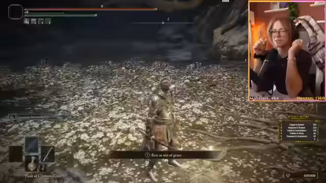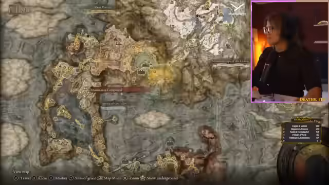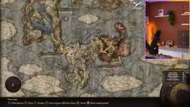 03:19:34Nach dem Sieg über Malenia plante der Streamer, noch viele Bosse zu jagen, basierend auf einer Liste von Leon. Er stellte fest, dass er in Limgrave noch acht Bosse verpasst hatte und begann, diese mit Hilfe einer interaktiven Karte zu suchen. Dabei ärgerte er sich über die tödlichen Wasserbereiche, die ihn sofort umbrachten, wenn er hineinfiel.