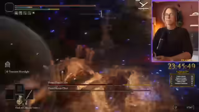 03:08:28Der Streamer hat nach 464 Versuchen Malenia besiegt, was an den Hardcore Classic Level Up von Sauerkurt erinnert. Während des Kampfes hatte er Probleme mit den Heilungseffekten seiner Potts und versuchte, die Laserangriffe zu vermeiden. Der Kampf war anspruchsvoll, wobei er feststellte, dass Malenia schwieriger war als erwartet, und spekulierte, ob die Bosse im DLC genauso schwer sein werden.