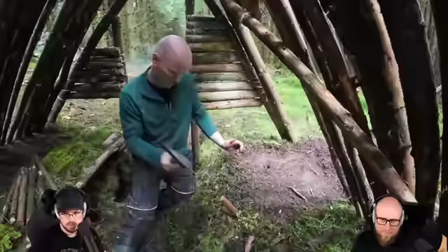03:58:50Nach der spannenden Erkundung wenden sich die Streamer einem Video von Wildhammer zu, das den Bau eines „Rainwater Roof Feeds My Wilderness Cooking Shelter“ zeigt. Sie bewundern den detaillierten Plan des Bauherrn und die Verwendung von Materialien wie Teer und Betum zur Abdichtung der Holzbalken. Der Aufbau des überdachten Koch-Shelters, der auf einem improvisierten Fundament errichtet wird, und die Installation von Regenrinnen zum Auffangen von Wasser werden intensiv kommentiert und als kreative Bushcraft-Lösung gelobt.