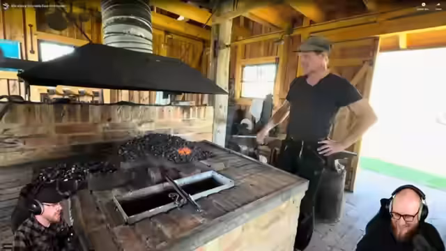 00:38:53Der Fokus verlagert sich auf ein zweites Video, das eine professionelle Schmiede-Esse zeigt. Die Streamer analysieren den Aufbau ausführlich: eine ummauerte Feuerstahlplatte mit Luftzufuhr von oben über Rohre. Besonders das von oben gesteuerte Fußpedal zur Regulierung der Luftzufuhr wird als sehr entspanntes Bedienkonzept bewundert. Die Konstruktion mit einer Stahlplatte als Basis und Backsteinen aus Lehmmörtel als Isolation wird im Detail besprochen.