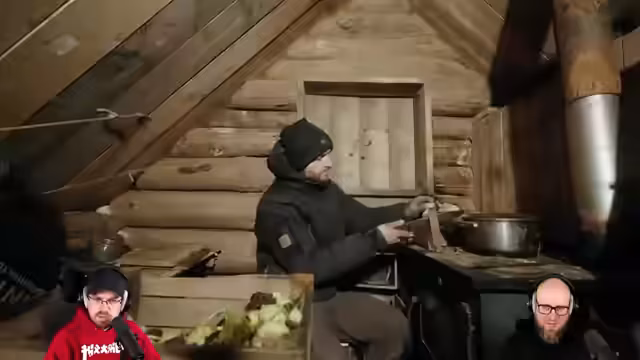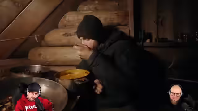 02:03:47Wegen beginnenden Regens wechselt der Streamer in die Blockhütte und plant, Kohlrabi vorzubereiten. Als energiereiche Mahlzeit wird Kürbissuppe gekocht, da der Ofen läuft und der See für den nächsten Tag Energie erfordert. Das intensive Vorbereiten von Brennnesseln wird als mühsam beschrieben – 300 Gramm ergeben nur etwa 100 Kalorien. Das Ziel ist, mit der Suppe Energie für einen möglichen Angelversuch am nächsten Tag zu tanken.