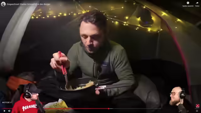 01:19:16Der Streamer teilt praktische Erfahrungen zur Toilettennutzung bei starkem Regen: Er verwendet einen Topf statt einer Flasche, da dieser eine größere Öffnung hat. Urin wird als steril eingestuft und nach Gebrauch ausgespült. Die Nacht verläuft mit starkem Schneefall, der das Zelt von außen eindrückt. Durch regelmäßiges Abklopfen des Schnees wird ein Kollaps verhindert, obwohl das ultraleichte Zelt eigentlich nicht für solche Bedingungen konzipiert ist. Am Morgen sind 20 cm Schnee gemessen worden, die Landschaft wirkt gefroren und sonnig.