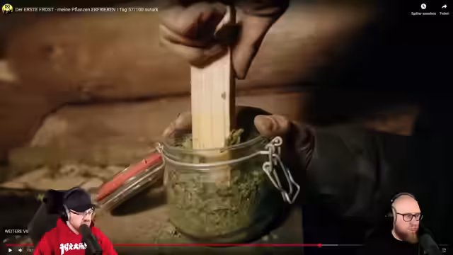 01:48:52Der Streamer trifft Vorbereitungen für den bevorstehenden Frost: Er muss Kohlrabi-Blätter entfernen und Brennnesseln trocknen. Das geladene E-Bike wird nicht genutzt, da der See zum Angeln zu weit entfernt ist und keine Energie vorhanden ist. Statt dessen wird beschlossen, Kürbissuppe zu kochen, um Kalorien für den nächsten Tag zu gewinnen. Als Frühstücksalternative werden Birnenmousse-Gläser geplant, da die Äpfel zur Neige gehen.