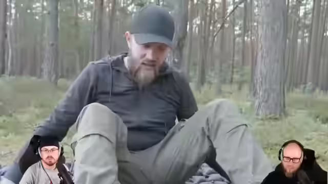 01:39:39Nachdem die eigenen Tests beendet sind, reagieren die Streamer auf ein externes Video von 'Pettis Bushcraft'. Darin baut ein Mann im irischen Wald eine längliche Hütte ('Raced Shelter') unter Verwendung von Holz und einer Rettungsdecke. Die Moderatoren bewundern die handwerklichen Fähigkeiten des Baumeisters, bemängeln aber, dass die Schlafunterlage für einen Erwachsenen viel zu kurz ist und die Hütte instabil wirkt. Die gezeigte Szene wird als kreative und unterhaltsame Ablenkung vom eigentlichen Themenschwerpunkt empfunden.