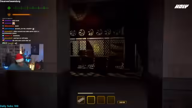 03:01:46Der Streamer und seine Mitspieler starten eine gruselige Runde in einem unbestimmten Spiel. Sie diskutieren die ersten Eindrücke aus Zuschauerperspektive, insbesondere wie ein Spieler (Chico) aus einem Bereich kommt und sich als echt herausstellt. Es herrscht angespannte Atmosphäre mit Aufforderungen zum schnellen Verlassen des Bereichs ("Komm raus!"), während sie die düstere Umgebung erkunden und sich auf die Abfahrt vorbereiten.