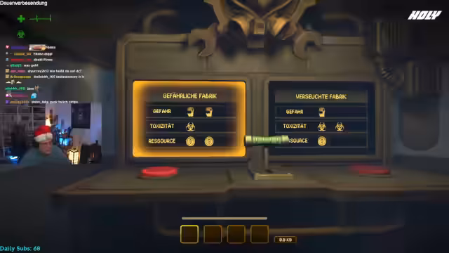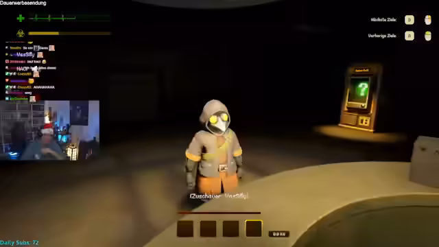 01:14:48Die Spieler diskutieren die Wahl zwischen verseuchter Zone und Fabrik, entscheiden sich für die Fabrik aufgrund geringerer Gefahr. Sie etablieren Teamleiter-Strukturen und betreten das Gebäude, wo sie auf einen Bär treffen. Verwirrung entsteht über die Anwesenheit weiterer Spieler, während sie erste Gegenstände wie eine Tastatur finden und über Verkaufsmöglichkeiten sprechen. Die Radioaktivitätsanzeige steigt, was Zeitdruck erzeugt.
