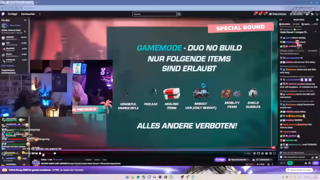 03:19:23Die Special Round wird angekündigt: Duo No Build mit exklusiven Items (nur Sniper, Pickaxe, Healing Items, Reboot Van). Der Streamer und sein Partner bereiten sich vor, diskutieren Munitionsmanagement und Bewegungsstrategien. Herausforderungen entstehen durch die eingeschränkte Waffenwahl – der Streamer bemängelt den Mangel an Sniper-Munition. Trotzdem wird versucht, durch Positionierung und Airdrop-Nutzung Punkte zu sammeln.