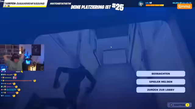 04:46:48Nach mehreren Runden des Fortnite-Cups platziert sich das Team auf dem 22. Platz. Die Platzierungen und die damit verbundenen Preisgelder werden vorgestellt, wobei das Team zwar keine Earnings gewinnt, aber eine Ehrenurkunde erhält. Der Streamer gratuliert allen Teilnehmern und präsentiert den Gewinner, KUVA UNT BUCHER, mit beeindruckenden 380 Punkten. Anschließend wird ein weiteres Spiel angekündigt, bei dem es um das Klettern in den Ranked-Rängen geht. Der Stream endet mit einem Dank an die Zuschauer und der Ankündigung eines neuen Minecraft-Projekts für den nächsten Tag.