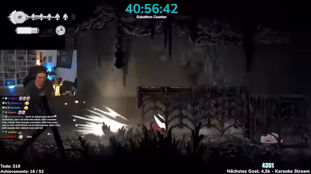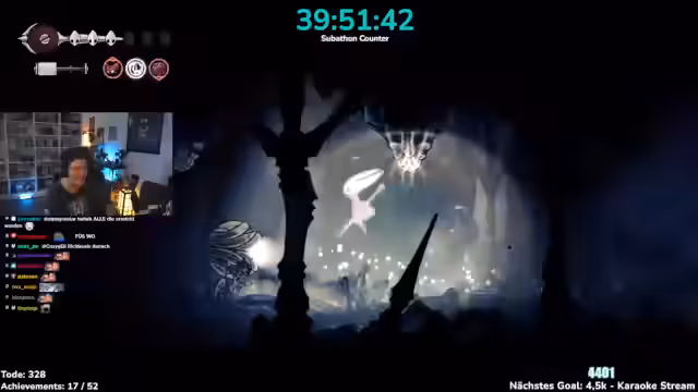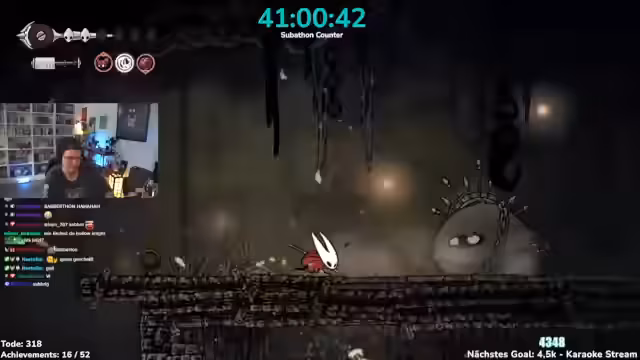 00:52:17Der Streamer kommentiert, dass er sich wie in einem Bloodborne-Gebiet fühlt und folgt einer Spur, um eine Quest zu erfüllen. Er findet seinen vermissten Bruder im Spiel, was einen Wunsch des Chats erfüllt. Er zitiert Hornet und lobt sie als Protagonistin. Er beschreibt einen neuen Teil des Gebiets und äußert Gänsehaut. Er interagiert mit zwei Charakteren, Krull und Benjen, die er als den Offline-Chat bei sich sieht. Die Charaktere bitten ihn, Kakerlaken-Eingeweide zu besorgen. Er findet die Musik in dem Gebiet sehr schön, stellt aber fest, dass ein bestimmter Bereich seine Seide komplett aufbraucht. Er möchte einen Charakter befreien, der in einer Zelle sitzt, obwohl dieser nicht befreit werden will. Er findet Maden in einem Wasserbereich und kommentiert, dass es eklig ist, aber er kein Leben verliert. Er befreit einen Charakter und kommentiert, dass dieser wie Guts ist. Der Streamer gibt eine Quest ab und erhält ein neues Achievement, eine erweiterte Werkzeugtasche, die es ihm ermöglicht, mehr Schalensplitter zu tragen.