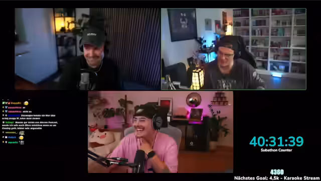 08:25:43Es wird angekündigt, dass ein Karaoke-Abend mit ungefähr zehn Personen bevorsteht, und es wird erwartet, dass es "krachen" wird. Es wird aufgeräumt und Mischen vorbereitet. Es gibt technische Probleme mit dem Stream, und es wird versucht, diese zu beheben. Zuschauer werden gebeten, nicht auf Instagram zu folgen, da nur Cringe-Content gepostet wird. Es werden Reels angesehen. Es werden verschiedene Videos und Bilder kommentiert, darunter Silksong-Videos und Tierbilder. Es wird ein Gericht gezeigt, das der Partner zubereitet hat. Es wird über Amazon-Käufe und faire Preise gesprochen. Es wird ein Mann gelobt, der gut aussieht und "slayt". Es werden Anekdoten aus der Schulzeit erzählt, darunter eine Geschichte über eine Mafia-Sex-Story mit Harry Styles, die von einer Lehrerin beim Elternabend vorgelesen wurde. Es wird ein Spoiler aus einem Spiel gezeigt. Es werden verschiedene Meinungen zu Themen im Chat ausgetauscht. Es wird erwähnt, dass Nick bald wieder da sein wird.